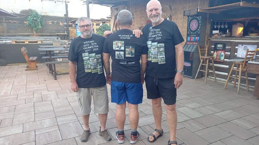 . Oběd jsme dostali, přestože objednávka putuje po Labi k moři. Evžen a jeho tým to zvládl. Osobně jsem byl velmi spokojen a rád jsem ho po letech zase potkal. Jízda na pláži byla příjemným zpestřením. Obnovily se vzpomínky na počáteční ročníky. Kemp zřejmě zlepšil své služby, což jsem usoudil z mnohem větší obsazenosti. Při současné obsazenosti si dost dobře neumím představit pohodové fungování srazu v Píšťanech. Příliš mnoho lidí, předchozí zkušenost s okradením během noci a super jídlo na Trumpetce mne vede k jasnému rozhodnutí pokračovat na Trupmpetce a nevracet se do Píšťan (husy přežiji). K soutěži Ural vs. Dněpr není potřeba cokoli dodávat. Zajímavé disciplíny, ale ten rozhodčí?