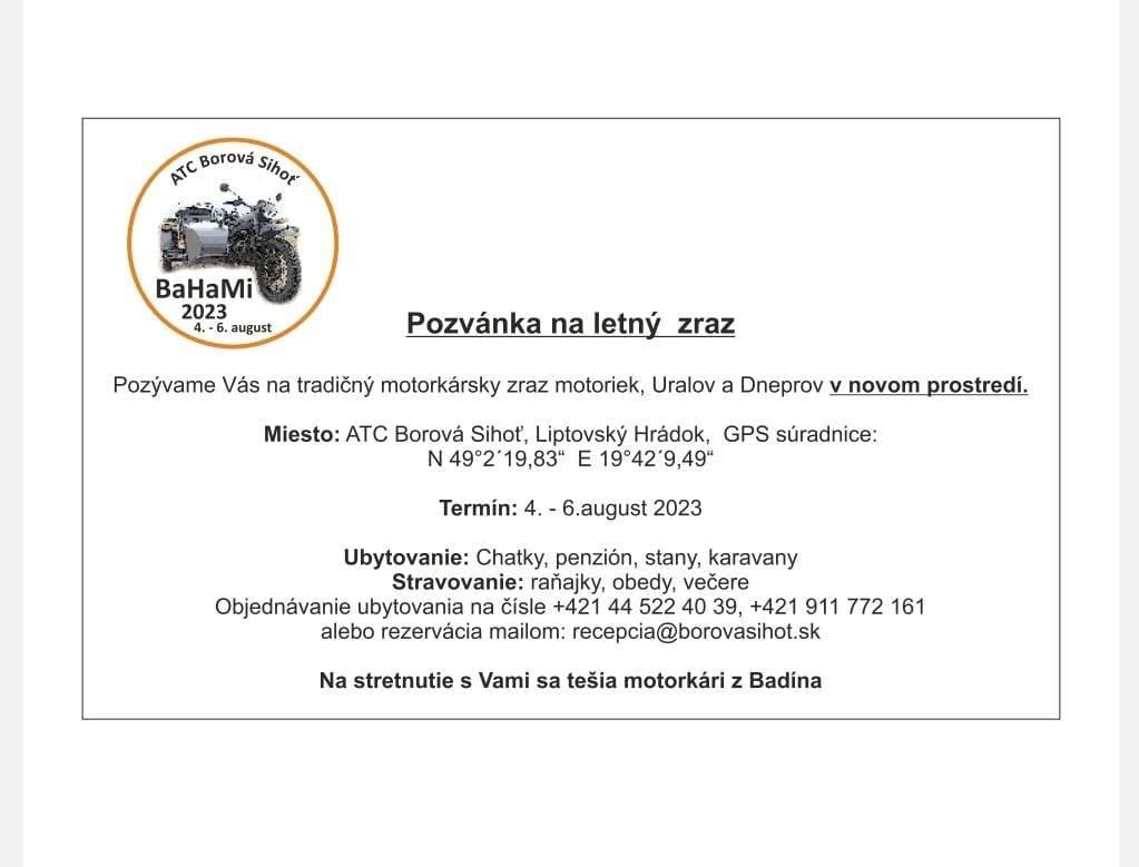 Dovoluji si v zastoupení našich kamarádů ze Slovenska vás pozvat na jejich sraz BaHaMi 2023. Tentokráte se bude konat v novém prostředí ATC Borová Sihoť (Liptovský Hrádok)
