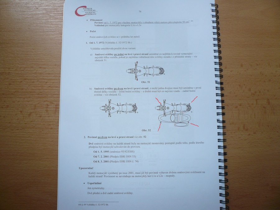 Ale tímto způsobem to nemá řešeno žádný motocykl se sajdou. Umístění první dvojice směrových světel má být umístěna v první třetině délky vozidla. A to v případě umístění směrovky na blatníku sajdy není splněno. Schválně jsem se díval do techničáku, jestli nemá Ural nějakou výjimku, ale nemá. Skočím se ještě zeptat na STK, jak na to pohlíží.