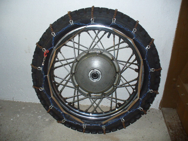 Já používal na Dněpru řetězy udělané z komponentů autořetězů a to i na pneu Heidenau 4,00/19 a vešlo se to tam a to byl pak tank pokuď mohl motor tak ho nic nezastavilo. Na Uralu tolik místa ke kardanu není tak přemýšlím o přepletení kola mimo osu asi tak o 10 mm. Dělal to už někdo, o kolik to snese aby vyšly dráty?