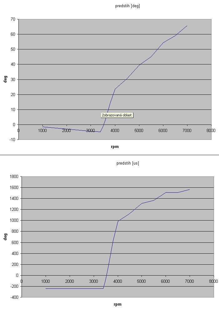 Eště k interpretaci naměřenejch hodnot - Já jsem měřil čas mezi impulsem z čidla a vypnutim výstupního tranzistoru a zaznamenával s opačnym znamínkem (předstih), ten jsem pak přes otáčky přepočítal na úhel. Jsou tam pak minimálně ještě dvě konstanty a to sice rezonanční frekvence resp. její převrácená hodnota cívky, což je zanedbatelné a mechanicky nastavenej úhel mezi h.ú. a impulsem z čidla. Ten neni zanedbatelnej a podle stupnice na zapalku je nastavitelnej v rozsahu +-10 stupňů. Takže ta křivka předstihu ve stupních neni absolutní, ale relativní. V reálu je posunutá ve směru osy y o nějakou konstantní hodnotu.