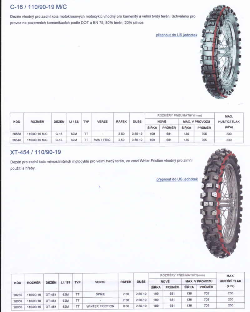 Kamarád z pneuservisu mi našel 2 pneumatiky, které by se hodily na naše zimní jízdy. Lepší by prý byla ta XT-454. Cena okolo 1400 Kč bez DPH.