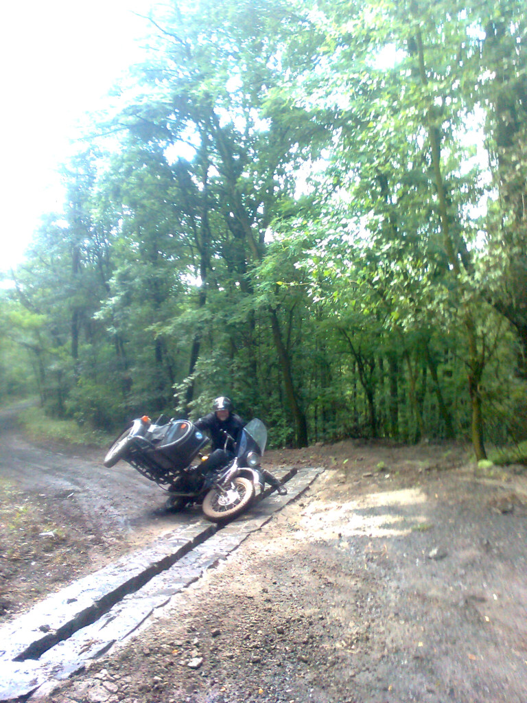 Ono to není tak hrozné, jak to vypadá. Zdeněk to jel všechno bez pohonu sajdy a navíc měl na Uralu značně sjetou pneumatiku. Sjezdy jsou sice někde trošku prudší, ale bez problémů jsem to sjel pouze s brzdou na zadní kolo u Dněpra. Výjezdy, pokud moc nezaprší vyjedou i jednokolky, maximálně někde zatlačí kulometčík. Jsou tam dva kameny, které umí dobře nakopnout sajdu, ale na základě včerejšího výletu mimo cestu tam pojedu krokem a ještě je zřetelně označím. Takže ani nemusíme volit trasu méně náročnou. Maximálně, pokud budou motorky bez sajdy, budou mít trasu kde se dá jet mimo terén.