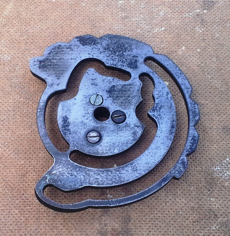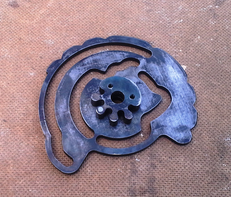 a ještě jednou z druhé strany; kulisa P4, hřebínek P10; řezáno vodním paprskem obojí, následně před kalením vyřezány závity, zahloubeno, sešroubováno a vystružen otvor prům. 10