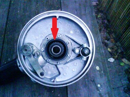 2) Ze skříně stálého převodu jsem demontoval stávající vnitřní hliníkové víčko, vyhodil jsem i to speciální "jakogufero+těsnění" pod ním. Místo něho jsem přímo do vnitřku skříně nalisoval standardní gufero (rozměry si už nepamatuju, odměřeny přímo), u kterého jsem jenom provedl zářez do vnějšího obvodu tak, aby zůstal průchodný odtokový kanálek dole.